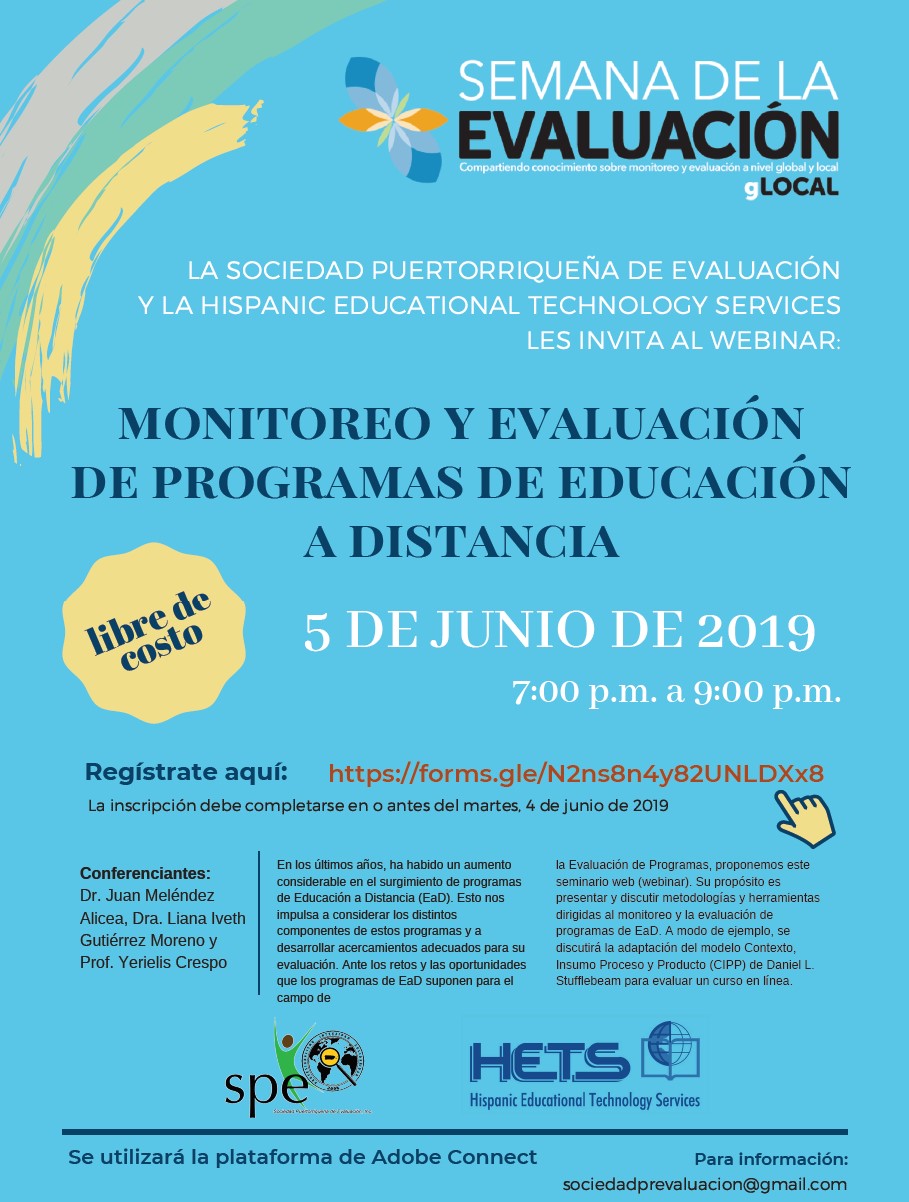 Como parte de las actividades programadas para celebrar la Semana de la Evaluación 2019, la Sociedad Puertorriqueña de Evaluación (SPE) y la Hispanic Educational Technology Services (HETS) se complacen en invitarles al seminario web (webinar)